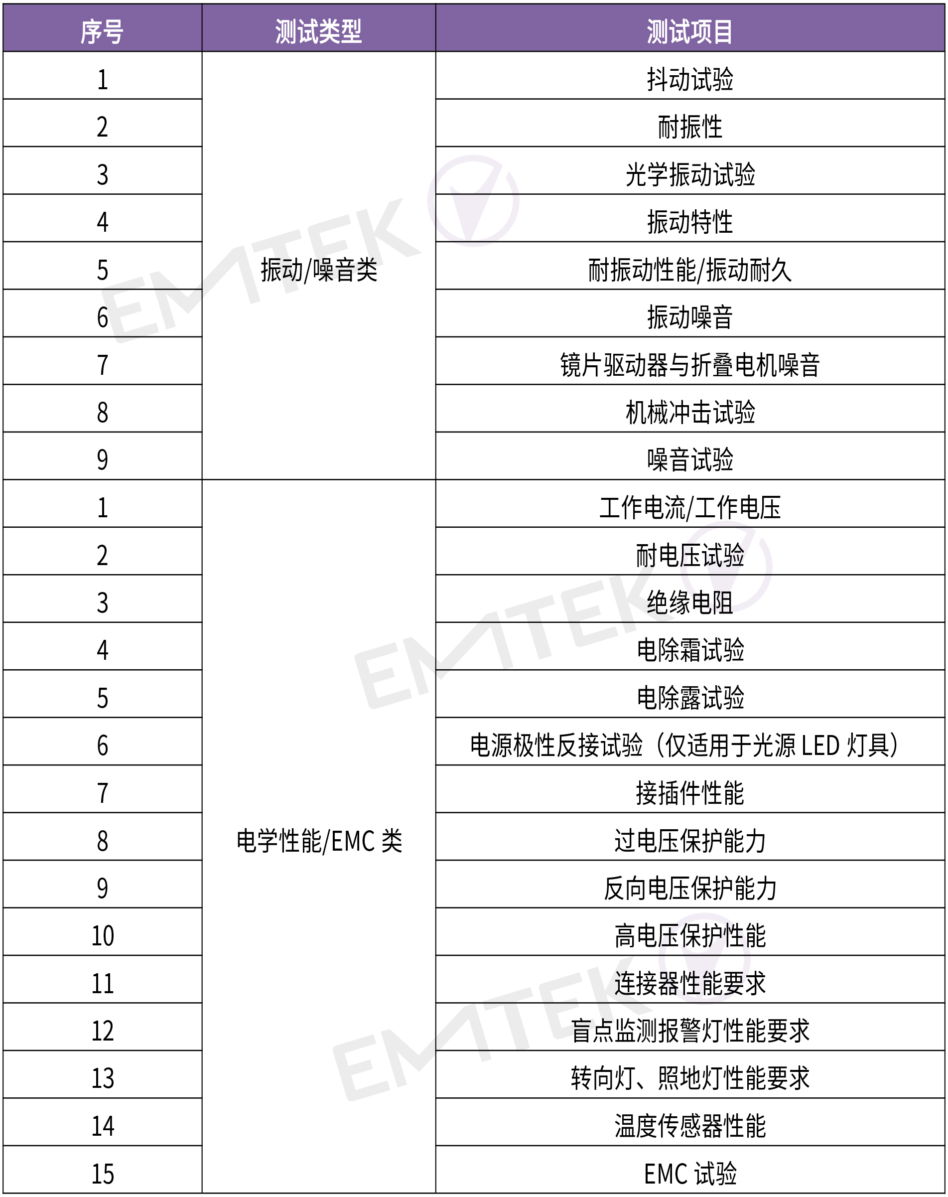 3. 電學(xué)試驗(yàn):考核后視鏡及其相關(guān)電器件(如轉(zhuǎn)向燈等)環(huán)境和功能試驗(yàn)前后的電學(xué)性能,驗(yàn)證其是否能正常使用;