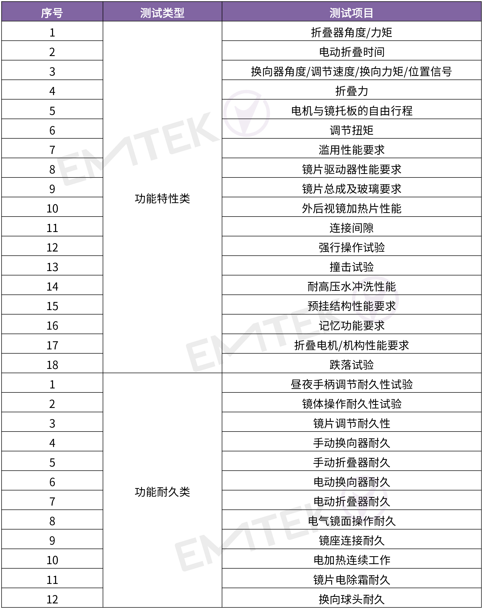 2. 功能可靠性試驗(yàn):考核后視鏡使用過(guò)程中承受的強(qiáng)度和剛性、操作功能特性及耐久、振動(dòng)試驗(yàn),比如折疊器性能、換向器性能、手動(dòng)/電動(dòng)換向器/折疊器耐久、鏡面操作耐久、撞擊性能、振動(dòng)耐久、噪音試驗(yàn)等;