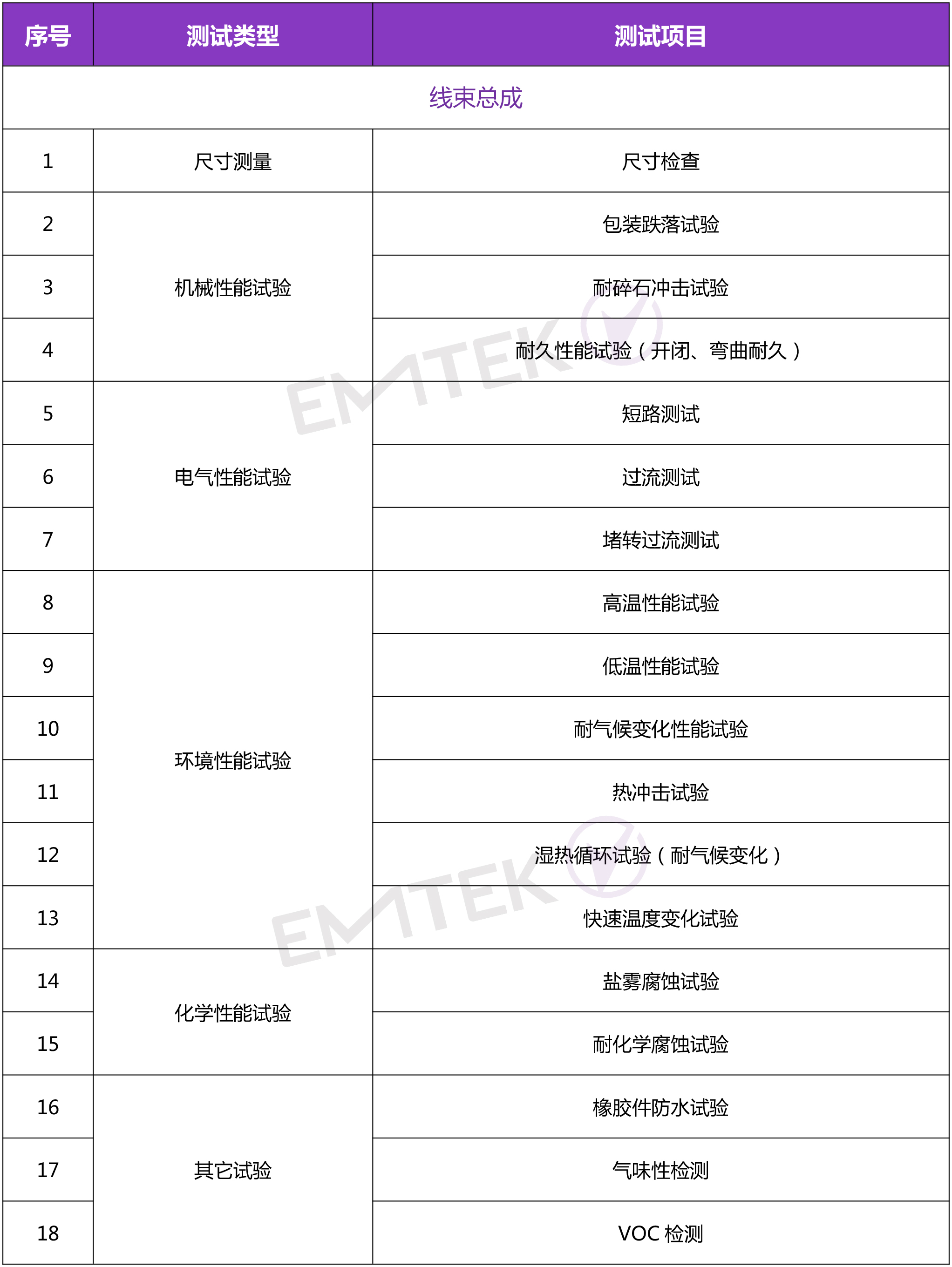 汽車(chē)線束環(huán)境空間多樣,經(jīng)歷復(fù)雜的濕熱變化和振動(dòng)變化。為確保線束功能可靠性,其材料選型和檢驗(yàn)、產(chǎn)品設(shè)計(jì)和驗(yàn)證、加工工藝設(shè)計(jì)和驗(yàn)證有嚴(yán)苛的標(biāo)準(zhǔn)規(guī)范和驗(yàn)證流程。典型的測(cè)試服務(wù)有ELV檢測(cè)、VOCs檢測(cè),以及機(jī)械性能、電氣性能、環(huán)境氣候性能等可靠性檢測(cè)。