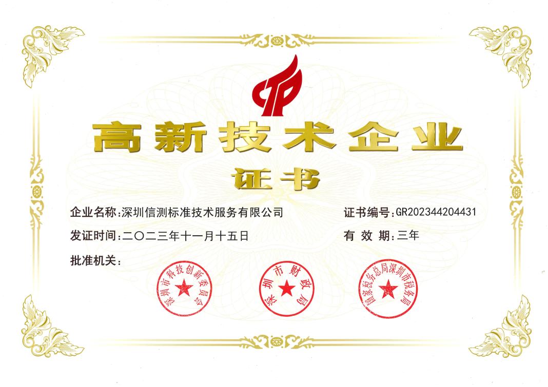 此次榮獲“高新技術企業”認定,是對我司綜合技術實力的權威認證,也是對信測標準深圳寶安檢測基地未來發展的鼓勵和鞭策。