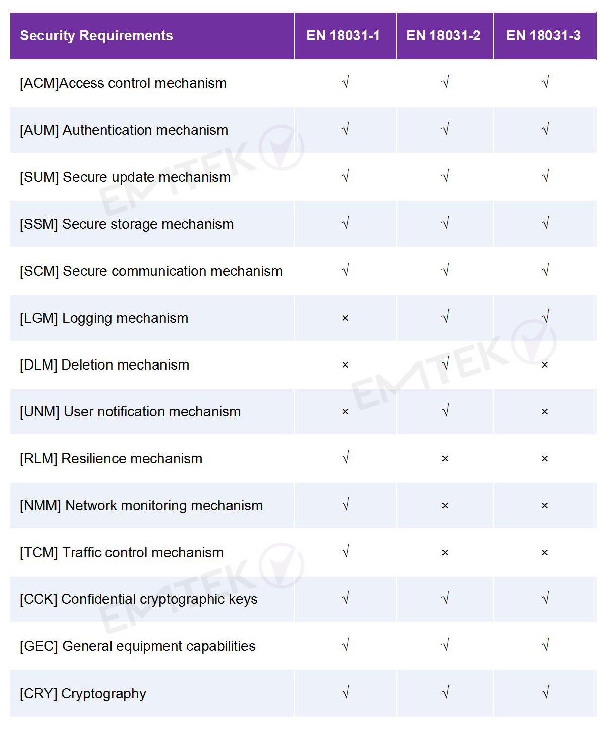 EN 18031各子標(biāo)準(zhǔn)與安全需求對應(yīng)表