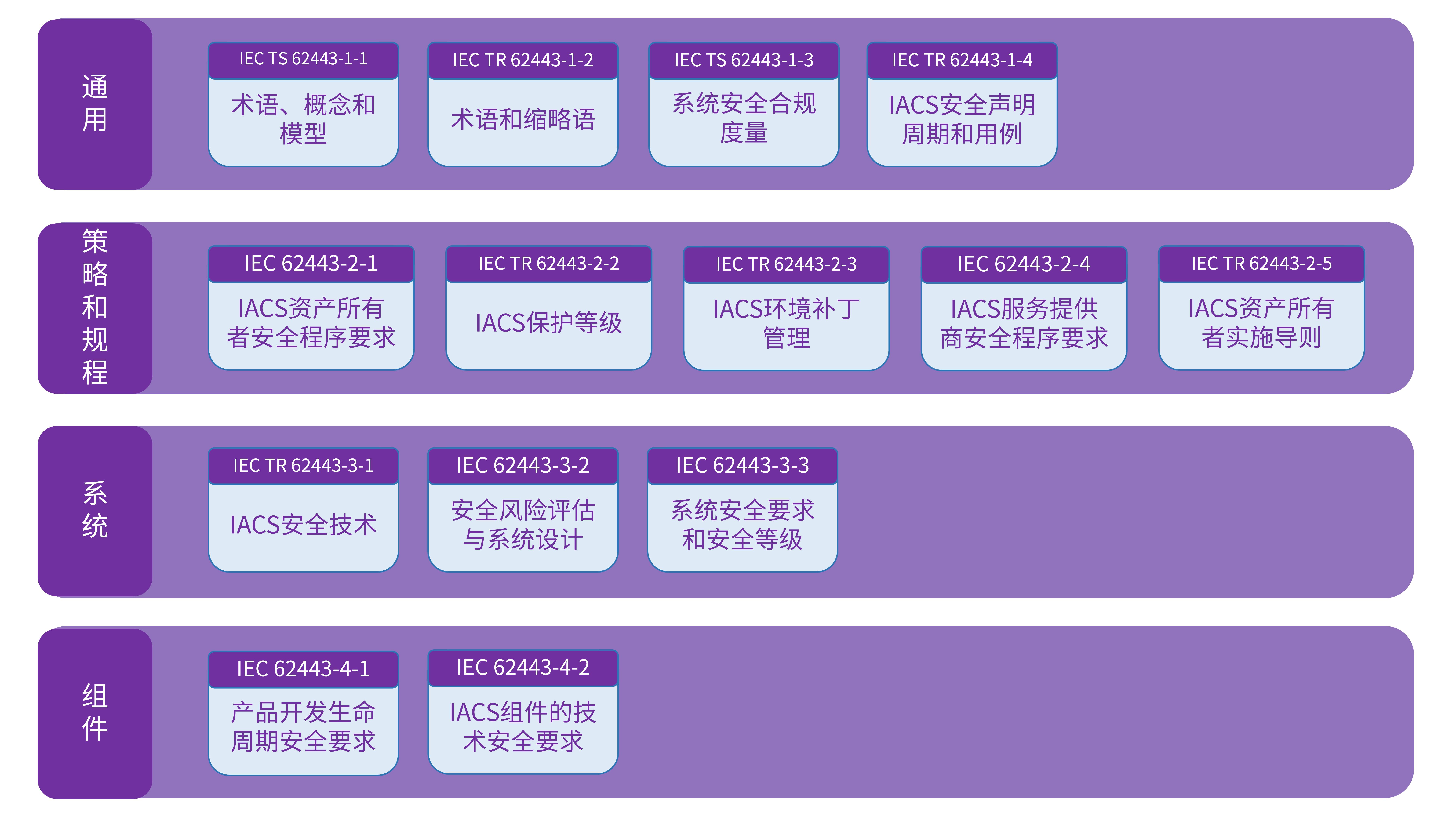 (4) 組件(IEC 62443-4-x):包含兩份文件,IEC 62443-4-1規(guī)定安全產(chǎn)品開發(fā)生命周期要求,IEC 62443-4-2規(guī)定系統(tǒng)組件的技術(shù)安全要求。