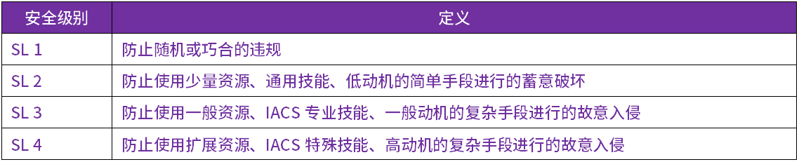 以上每個(gè)安全大類均定義了多個(gè)CR和RE(增強(qiáng))來映射到不同的安全級(jí)別SL中,安全級(jí)別越高,安全需求要求也越高。IEC 62443-4-2中定義了四種安全級(jí)別SL,如下: