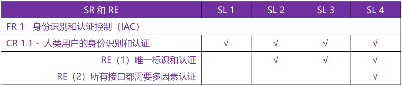 上面截圖所示,當(dāng)要達(dá)到安全級(jí)別3級(jí),需要同時(shí)滿足CR 1.1、RE(1)的要求。當(dāng)要達(dá)到安全級(jí)別4級(jí),需要同時(shí)滿足CR 1.1、RE(1)、RE(2)的要求。