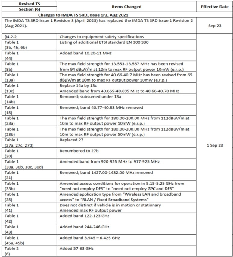 2023 年9 月 1 日,新加坡 IMDA 發(fā)布了《短程設(shè)備技術(shù)規(guī)范》(IMDA TS SRD),第1 期,第3 版,取代了IMDA TS SR D 第1 期第 2 版,并于2023 年9 月1 日生效。