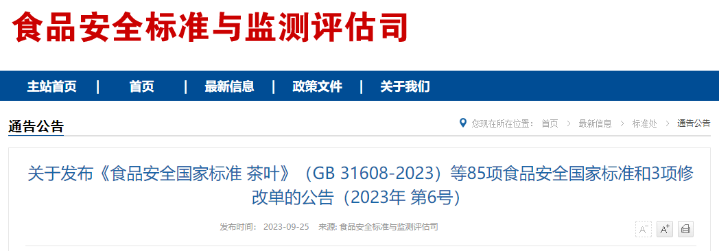 關(guān)于發(fā)布《食品安全國(guó)家標(biāo)準(zhǔn) 茶葉》(GB 31608-2023)等85項(xiàng)食品安全國(guó)家標(biāo)準(zhǔn)和3項(xiàng)修改單的公告(2023年 第6號(hào))