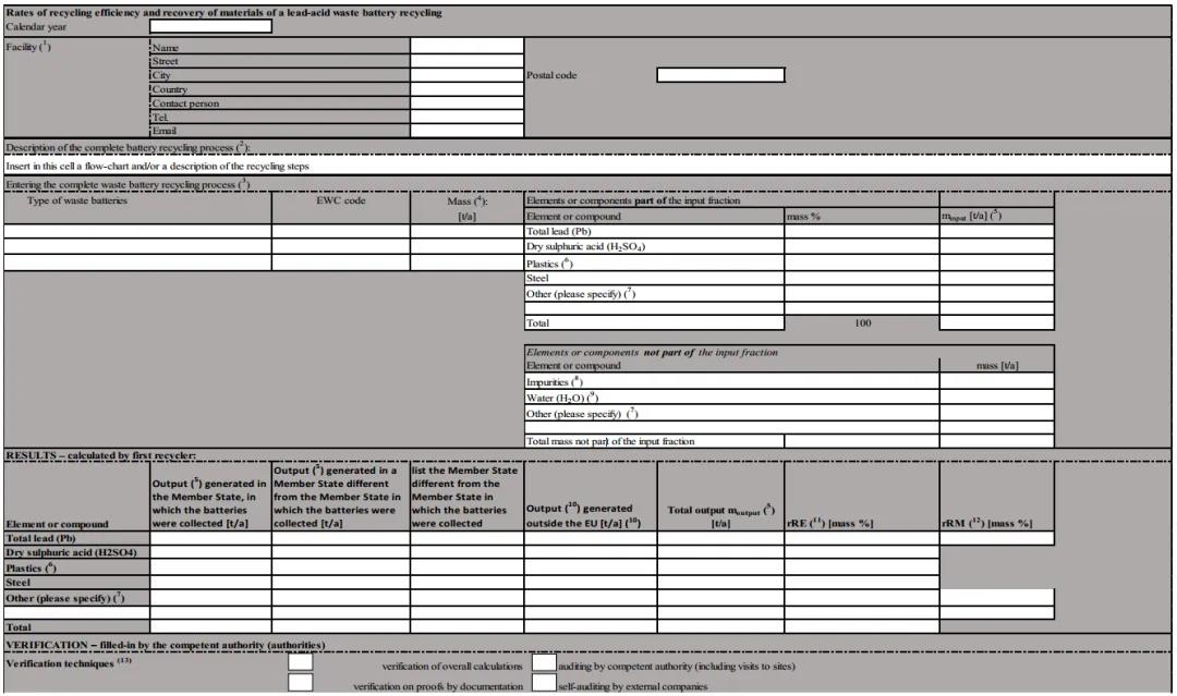 該法案詳細規(guī)定了電池回收效率和材料回收率的計算文件填報方法,并為鉛酸廢電池、鋰基廢電池、鎳鎘廢電池、其他廢電池分別設定相應的文件格式。