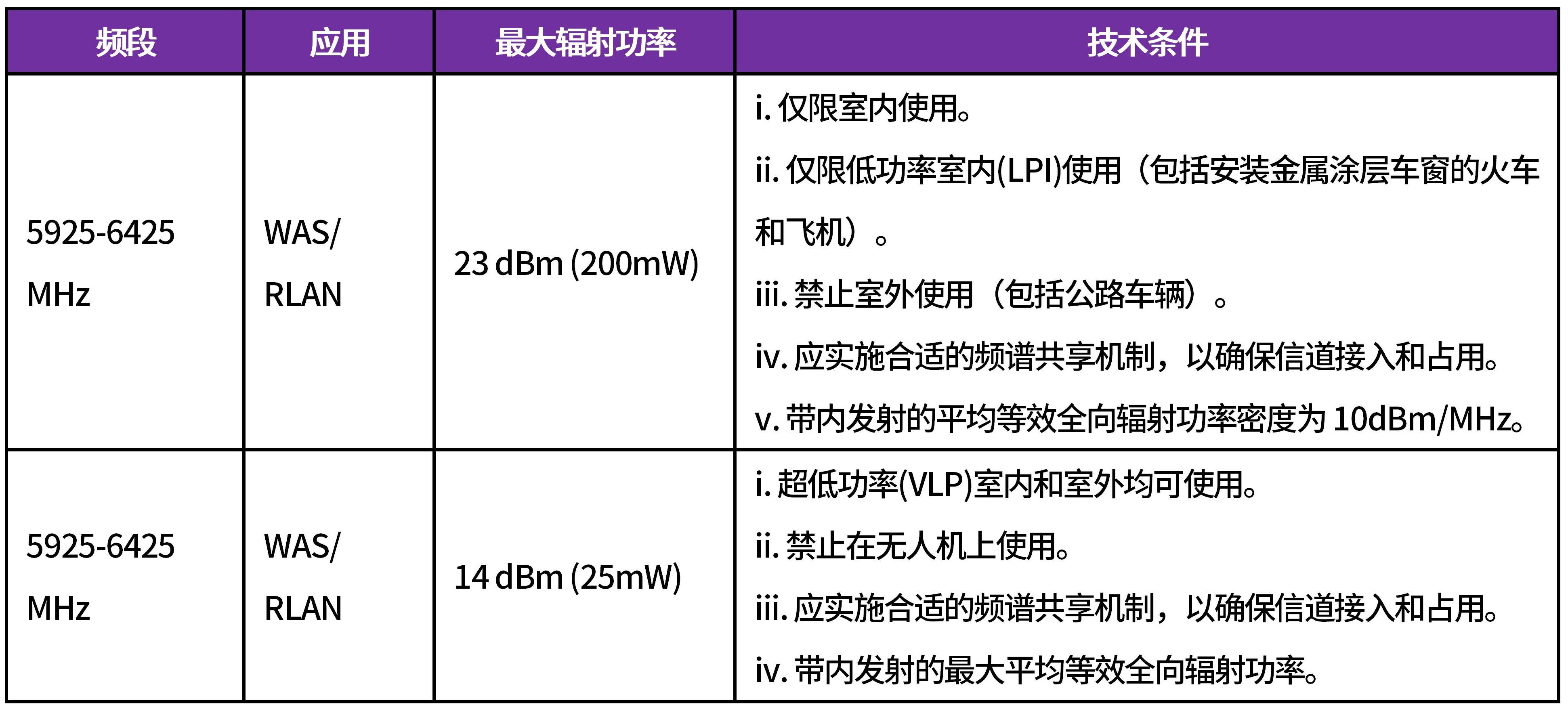 根據(jù)該提案草案,NCA授權(quán)將5925-6425 MHz (L6GHz)頻段用于無(wú)線接入系統(tǒng)/無(wú)線局域網(wǎng),初步制定的技術(shù)和操作條件如下: